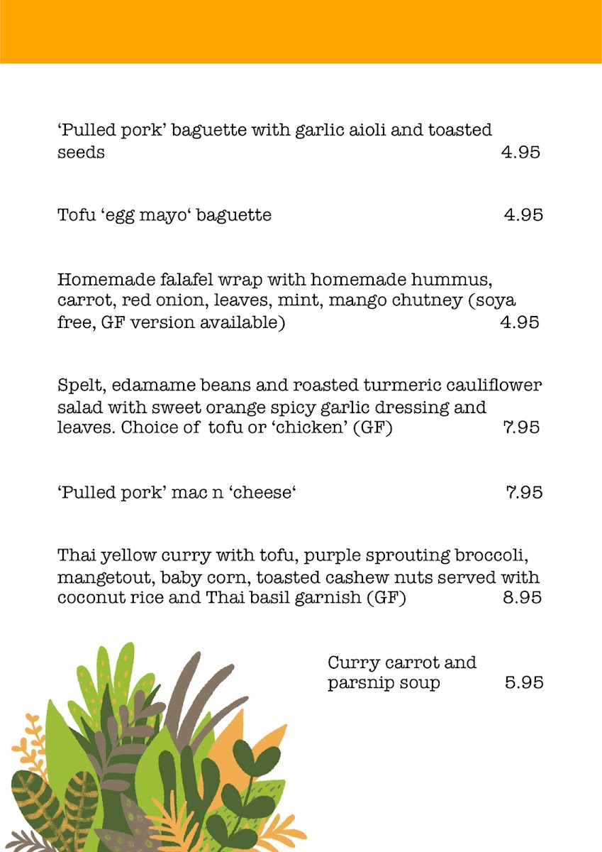 Food items are grouped into categories including breakfast plates, wraps, burgers, soups, and noodle dishes. Breakfast options feature items such as the Big Breakfast, tofu scramble on toast, sourdough toast, and breakfast waffles. Wraps include varieties like the portobello mushroom wrap and homemade falafel wrap. For more substantial meals, there are options like the bean burger with homemade fries and udon noodles with peppers, green beans, crispy tofu, and a sweet chilli and ginger sauce. Soup of the day and pumpkin soup are also available.