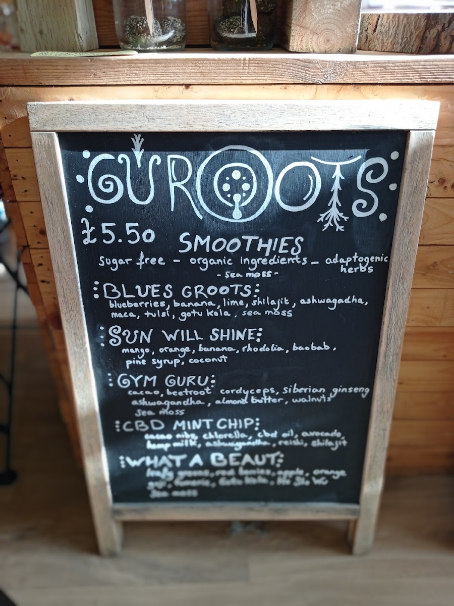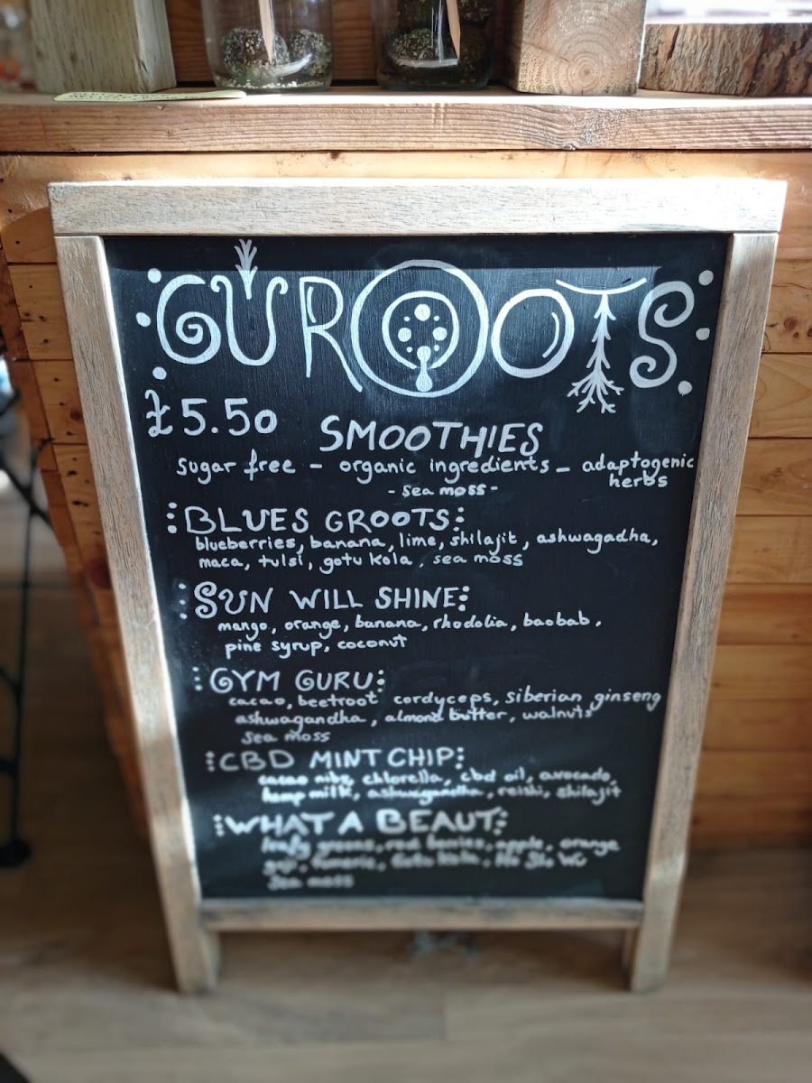 The drink selection includes a variety of coffee options such as soya milk cappuccinos, as well as smoothies like Cbd Mint Chip and What A Beaut. Hot beverages include speciality lattes, with choices extending to chai and turmeric lattes.